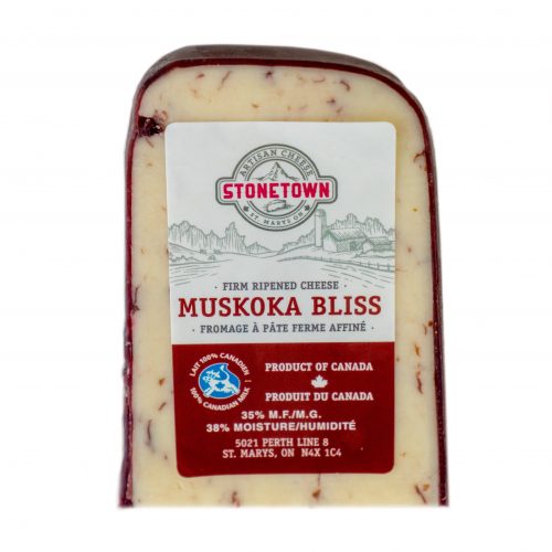 Muskoka Bliss is very creamy and is made with dried cranberries from Muskoka. It tastes great on a cheese platter with fruits and nuts or as a snack. It also melts very well, making it a special treat for raclette or grilled cheese sandwiches. Pairs well with light-bodied red wine.