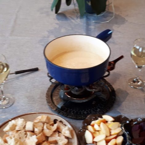 - Rub the caquelon (fondue pan) with half a clove of garlic, cut into small pieces and leave in caquelon.