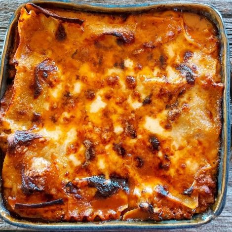- Lasagna Sause; Heat up oil in a large sauce pan over medium heat. Add ground beef and fry until brown. Add onion and garlic and cook for 5 min. Add maple syrup, diced and crushed tomatoes, salt and Italiano herbs. Simmer for 40 min.