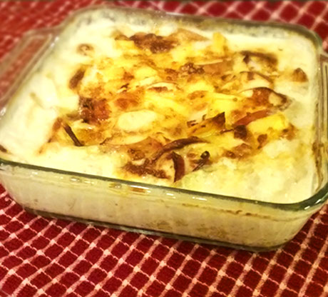 - Combine the potatoes, apples and Grand Trunk cheese together in a 2 litre gratin dish.