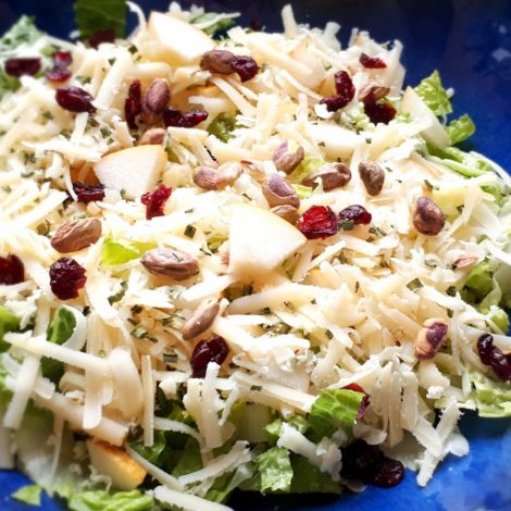 - In a large salad bowl, combine romaine lettuce, pears, Wildwood cheese, cranberries and pistachios