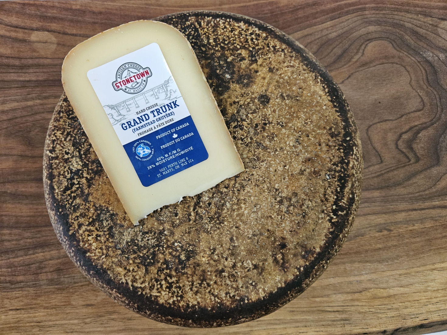 Grand Trunk is a farmstead Gruyere style cheese made with the traditions and recipe from the Swiss Alps. The careful ripening for 15 months includes washing the rind with wine yeasts resulting in both a visually stunning exterior, and a harder, drier interior that becomes rich and creamy in your mouth with a deep complex flavour, balanced, yet pleasantly persistent. Grand Trunk is named after the old railway bridge of the former Grand Trunk Railway in St Marys.
